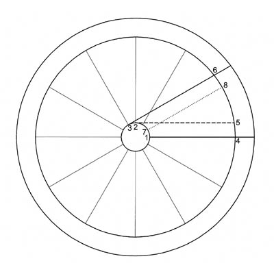 y la exterior, que va de 5 a 6. La línea 7-8, de puntos, indica la contrahuella del peldaño superior.