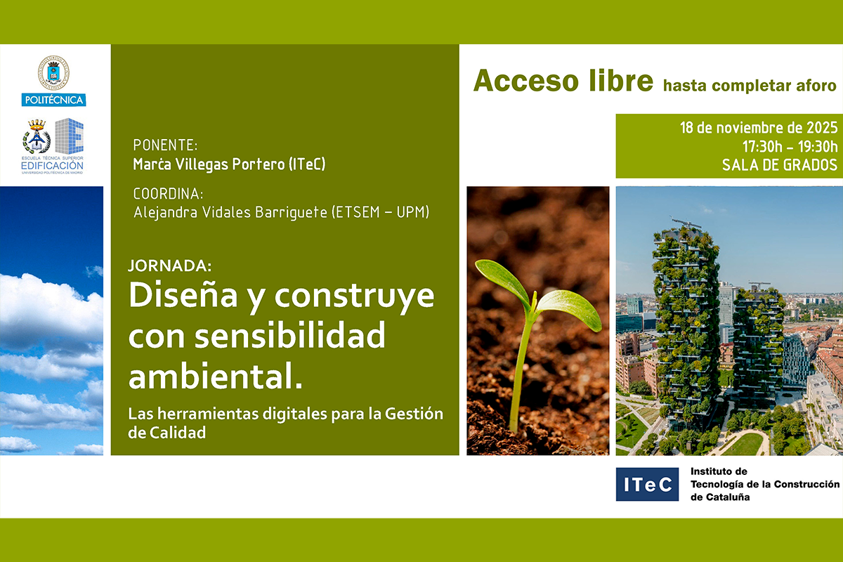 El Instituto de Tecnología de la Construcción (ITeC) visitará nuestra Escuela para ofrecer una presentación detallada de su software gratuito de gestión del proceso constructivo y del mantenimiento de edificios. Esta herramienta, ampliamente utilizada en el sector, permite organizar de forma eficiente todas las fases de la obra, realizar el seguimiento de los controles y ensayos de calidad, y verificar de manera sistemática el cumplimiento de la normativa vigente.
