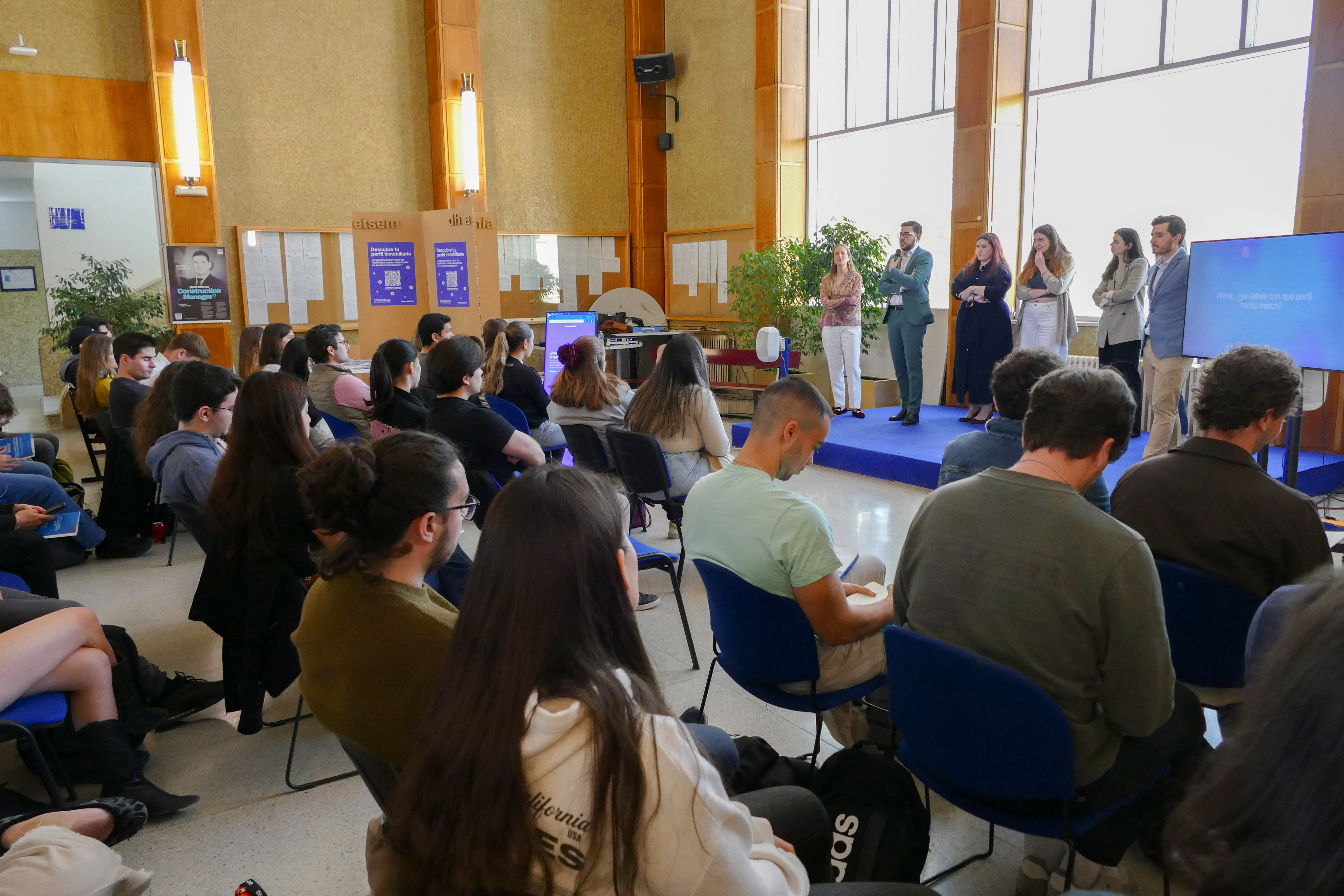 Durante la jornada, los estudiantes tuvieron la oportunidad de escuchar a profesionales que, como ellos, pasaron por las aulas de la ETSEM. Hoy están trabajando en empresas líderes del sector inmobiliario y compartieron con total honestidad sus trayectorias, aciertos, dudas y aprendizajes.
